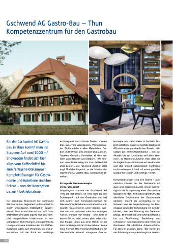 Bei der Gschwend AG Gastro- Bau in Thun kommt man ins Staunen: Auf rund 1000 m2 Showroom findet sich hier alles vom Kaffeelöffel bis zum fertigen Hotelzimmer. Komplettlösungen für Gastro- nomie und Hotellerie sind ihre Stärke – von der Konzeption bis zur Inbetriebnahme.