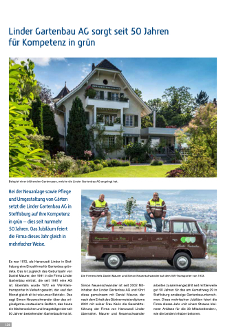 Es war 1972, als Hansruedi Linder in Stef- fisburg eine Einzelfirma für Gartenbau grün- dete. Das ist zugleich das Geburtsjahr von Daniel Maurer, der 1991 in die Firma Linder Gartenbau eintrat, die seit 1981 eine AG ist. Ebenfalls wurde 1972 ein VW-Klein- transporter in Verkehr gesetzt, der «auf den Monat gleich alt ist wie unser Betrieb». Das sagt Simon Neuenschwander über das ori- ginalgetreu restaurierte Gefährt, das heute ein Markenzeichen und Imageträger der seit 50 Jahren bestehenden Gartenbaufirma ist.