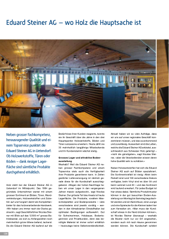 Neben grosser Fachkompetenz, herausragender Qualität und ei- nem Topservice punktet die Eduard Steiner AG in Uetendorf: Ob Holzwerkstoffe, Türen oder Böden – dank riesiger Lager- fläche sind sämtliche Produkte durchgehend erhältlich.