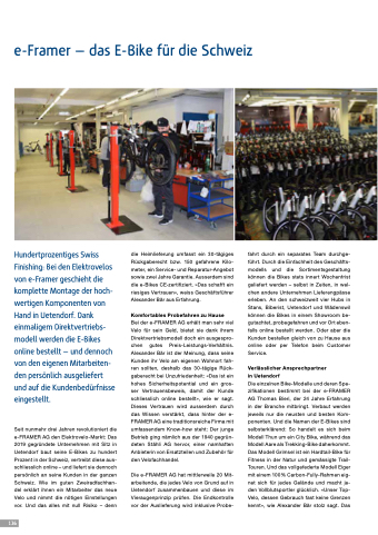 Bei der e-FRAMER AG erhält man sehr viel Velo für sein Geld, bietet sie dank ihrem Direktvertriebsmodell doch ein ausgespro- chen gutes Preis-Leistungs-Verhältnis. Alexander Bär ist der Meinung, dass seine Kunden ihr Velo am eigenen Wohnort fah- ren sollten, deshalb das 30-tägige Rück- gaberecht bei Unzufriedenheit: «Das ist ein hohes Sicherheitspotential und ein gros- ser Vertrauensbeweis, damit der Kunde schliesslich online bestellt», wie er sagt. Dieses Vertrauen wird ausserdem durch das Wissen verstärkt, dass hinter der e- FRAMER AG eine traditionsreiche Firma mit umfassendem Know-how steht: Der junge Betrieb ging nämlich aus der 1940 gegrün- deten Stähli AG hervor, einer namhaften Anbieterin von Ersatzteilen und Zubehör für den Velofachhandel.