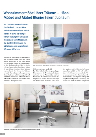 Als Traditionsunternehmen in Familienbesitz setzen Hänni Möbel in Uetendorf und Möbel Blunier in Ulmiz auf kompe- tente Beratung und umfassen- den Service beim Möbelkauf. Die Kunden stehen ganz im Mittelpunkt, das nunmehr seit 50 sowie 65 Jahren.