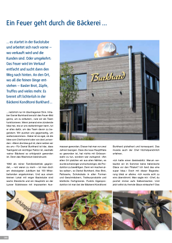 ... es startet in der Backstube und arbeitet sich nach vorne – wo verkauft wird und die Kunden sind. Oder umgekehrt: Das Feuer wird im Verkauf entfacht und sucht dann den Weg nach hinten. An den Ort, wo all die feinen Dinge ent- stehen – Basler Brot, Züpfe, Truffes und vieles mehr. Es brennt oft lichterloh in der Bäckerei Konditorei Burkhard ...