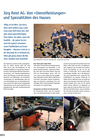 len Service aus dem Hause Reist sind nicht billig. Lieber hebt man sich von Mitbewer- bern angenehm ab und liefert eine authen- tische Top-Qualität, an der es rein gar nichts zu rütteln gibt. «Es ist genau diese zuverlässige Qualität, die in der Baubran- che enorm geschätzt wird», weiss der Ge- schäftsführer aus eigener Erfahrung. Er selbst wirkt im Betrieb schon so lange mit, dass er sich spontan nicht mal auf eine Jah- reszahl einigen kann. Das tut der Sache jedoch keinen Abbruch. Im Gegenteil, es zeigt, dass da Leute am Werk sind mit Er- fahrung, die blind wissen, was sie draufha- ben und was ihre Kunden wollen und brau- chen. Und das ist Gold wert.