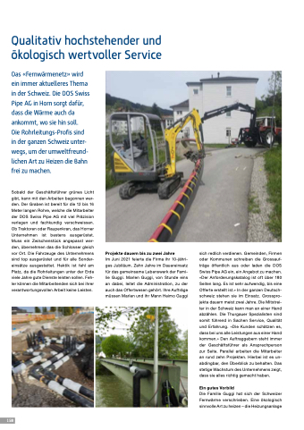sich redlich verdienen. Gemeinden, Firmen oder Kommunen schreiben die Grossauf- träge öffentlich aus oder laden die DOS Swiss Pipe AG ein, ein Angebot zu machen. «Der Anforderungskatalog ist oft über 180 Seiten lang. Es ist sehr aufwendig, bis eine Offerte erstellt ist.» In der ganzen Deutsch- schweiz stehen sie im Einsatz. Grosspro- jekte dauern meist zwei Jahre. Die Mitstrei- ter in der Schweiz kann man an einer Hand abzählen. Die Thurgauer Spezialisten sind somit führend in Sachen Service, Qualität und Erfahrung. «Die Kunden schätzen es, dass bei uns alle Leistungen aus einer Hand kommen.» Den Auftraggebern steht immer der Geschäftsführer als Ansprechperson zur Seite. Parallel arbeiten die Mitarbeiter an rund zehn Projekten. Hierbei ist es un- abdingbar, den Überblick zu behalten. Das stetige Wachstum des Unternehmens zeigt, dass sie alles richtig gemacht haben.
