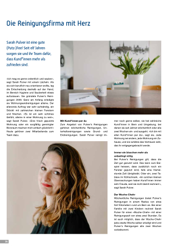 «Ich mag es gerne ordentlich und sauber», sagt Sarah Pulver mit einem Lächeln. Als sie sich beruflich neu orientieren wollte, lag die Entscheidung deshalb auf der Hand, im Bereich Hygiene und Sauberkeit etwas aufzubauen. Sie gründete Pulver’s Reini- gungen 2009. Ganz am Anfang erledigte sie Wohnungsendreinigungen alleine. Der allererste Auftrag war sehr aufwändig, ein Stöckli mit zahlreichen kleinen Fenstern und Nischen. «Es ist ein sehr schönes Gefühl, alleine in einer Wohnung zu sein», sagt Sarah Pulver. «Eine frisch geputzte Wohnung oder ein sorgfältig gereinigter Büroraum machen mich einfach glücklich!» Heute gehören zwei Mitarbeitende zum Team dazu.