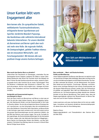 das Bundeshaus oder zahlreiche international bekannte Unternehmen. Für unsere Identität als Bernerinnen und Berner spielt aber noch viel mehr eine Rolle: die regionale Vielfalt, die Zweisprachigkeit, gelebte Tradition ebenso wie ein innovativer Wirtschafts- und Forschungsstandort. Wir können alle zum positiven Image unseres Kantons beitragen.