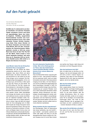 Die Mitte des 19. Jahrhunderts vom Gen- fer Novellisten und Zeichner Rodolphe Töpffer erfundenen Comics sind heute ein eigenständiges Genre des Litera- tur-Angebots. Vielfältig ausgerichtete Kunstschaffende brachten eine hoch- stehende Kunstform hervor, die in allen relevanten Kreisen höchste Anerken- nung findet. Einer dieser Künstler ist der Berner Illustrator und Comic-Autor Jared Muralt. 2015 mit dem ‹Comicsti- pendium der Deutschschweizer Städte› gefördert, brachte er 2018 den ersten Band einer Serie mit dem Titel ‹The Fall› auf den Markt. Damit erregte er kurz darauf weltweites Aufsehen, weil seine Story am 31. Dezember 2019 zur furcht- baren Realität wurde. 2020 erhielt er in Belgien den Atomium-Comicpreis.
