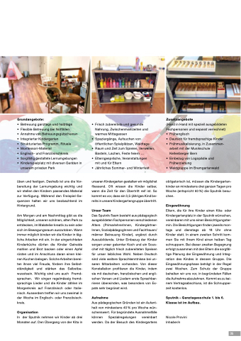 Am Morgen und am Nachmittag gibt es die Möglichkeit, unseren schönen, alten Park zu entdecken, im Malatelier kreativ zu sein oder sich im Bewegungsraum auszutoben. Wann immer möglich binden wir die Kinder in täg- liche Arbeiten mit ein. In der eingerichteten Kinderküche dürfen die Kinder Getreide mahlen und Brot backen oder einen Apfel rüsten und im Anschluss daran einen klei- nen Kuchen belegen. Solche Arbeiten berei- ten ihnen viel Freude, fördern ihre Selbst- ständigkeit und stärken das Selbstbe- wusstsein. Wichtig sind uns auch Fremd- sprachen. Wir singen regelmässig fremd- sprachige Lieder und die Kinder zählen im Morgenkreis auf Französisch oder Italie- nisch. Ausserdem treffen wir uns zweimal in der Woche im Englisch- oder Französisch- kreis.