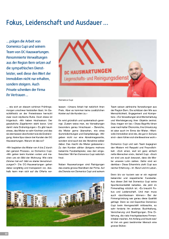 ... prägen die Arbeit von Domenico Cupi und seinem Team von DC Hauswartungen. Renommierte Verwaltungen aus der Region Bern setzen auf die sympathischen Dienst- leister, weil diese den Wert der Immobilien nicht nur erhalten, sondern steigern. Auch