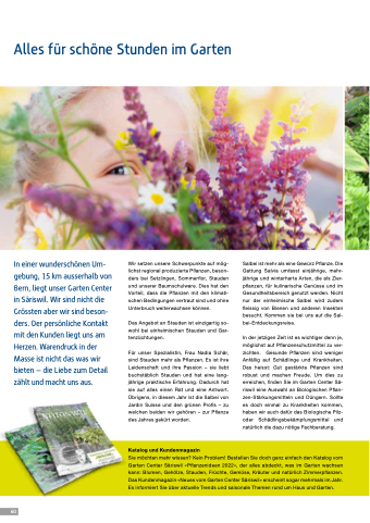 Sie möchten mehr wissen? Kein Problem! Bestellen Sie doch ganz einfach den Katalog vom Garten Center Säriswil «Pflanzenideen 2022», der alles abdeckt, was im Garten wachsen kann: Blumen, Gehölze, Stauden, Früchte, Gemüse, Kräuter und natürlich Zimmerpflanzen. Das Kundenmagazin «Neues vom Garten Center Säriswil» erscheint sogar mehrmals im Jahr. Es informiert Sie über aktuelle Trends und saisonale Themen rund um Haus und Garten.