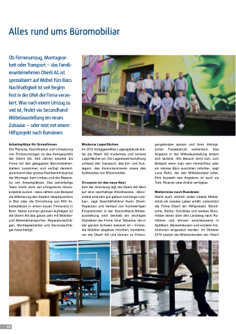 Ob Firmenumzug, Montagear- beit oder Transport – das Famili- enunternehmen Oberli AG ist spezialisiert auf Möbel fürs Büro. Nachhaltigkeit ist seit Beginn fest in der DNA der Firma veran- kert. Was nach einem Umzug zu viel ist, findet via Secondhand- Möbelausstellung ein neues Zuhause – oder reist mit einem Hilfsprojekt nach Rumänien.