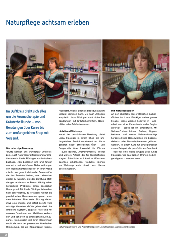 Nebst der persönlichen Beratung bietet Linda Flückiger in ihrem Shop ein um- fangreiches Produktesortiment an. Dazu gehören nebst ätherischen Ölen – von Bergamotte über Lavendel bis Zitrone – auch Bücher, Aromavernebler, Wickel und weitere Artikel, die für Wohlbefinden sorgen. Sämtliche im Lädeli in München- buchsee erhältlichen Produkte können via Webshop auch direkt nach Hause bestellt werden.