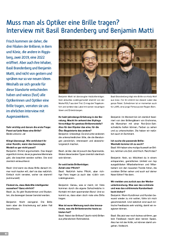 Frisch kommen sie daher, die drei Filialen der Brillerei; in Bern und Köniz, die andere in Riggis- berg, zwei 2019, eine 2022 eröffnet. Aber auch ihre Inhaber, Basil Brandenberg und Benjamin Matti, sind nicht von gestern und sprühen nur so vor neuen Ideen. Weshalb sie sich gerade für diese Standorte entschieden haben und wieso (fast) alle Optikerinnen und Optiker eine Brille tragen, verraten sie uns im ehrlichen Interview mit Augenzwinkern.