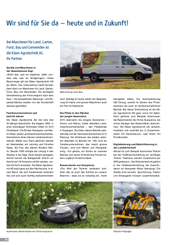 Hanspeter Käser. Die Automatisierung hält Einzug, sowohl im Garten des Privat- besitzers als auch im landwirtschaftlichen Betrieb. Bei dieser Entwicklung ist die Kä- ser Agrotechnik AG ganz vorne mit dabei. Dazu gehören zum Beispiel Automower, die Rasenroboter der Firma Husqvarna, die immer häufiger das Rasenmähen überneh- men. Die Käser Agrotechnik AG verkauft, installiert und unterhält sie, in Zusammen- arbeit mit Gartenbauern, oder direkt mit Privatkunden.