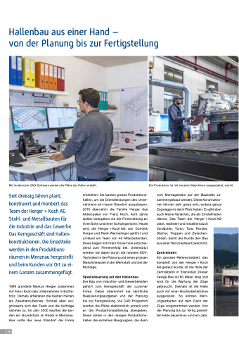 entstehen. Sie bauten grosse Produktions- hallen, um die Dienstleistungen des Unter- nehmens am neuen Standort auszubauen. 2010 übernahm die Familie Herger das Aktienpaket von Franz Koch. Acht Jahre später übergaben sie die Firmenleitung an ihren Sohn und ihren Schwiegersohn. Heute wird die Herger + Koch AG von Dominik Herger und René Wermelinger geführt und umfasst ein Team von 40 Mitarbeitenden. Diese tragen mit ihrem Know-how entschei- dend zum Firmenerfolg bei. Unterstützt werden sie dabei durch die neusten EDV- Techniken in der Planung und einen grossen Maschinenpark in der Werkstatt und bei der Montage.