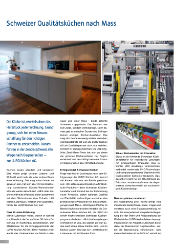 nauer und Isidor Roos – beide gelernte Schreiner – gegründet. Der Standort war kein Zufall, sondern wohlüberlegt. Denn da- mals gab es zwischen Sursee und Zofingen keinen einzigen Küchen-Aussteller. Das mag sich heute ein wenig anders verhalten; nichtsdestotrotz hat sich die LURO Küchen AG als Qualitätspartner nicht nur etabliert, sondern ist stetig gewachsen: Die ursprüng- liche Zwei-Mann-Firma hat sich zu einem der grössten Küchenanbieter der Region entwickelt und beschäftigt heute am Stand- ort Dagmersellen über 40 Mitarbeitende.