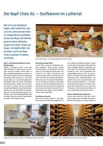 Täglich – 365 Tage im Jahr – wird in der Napf-Chäsi AG in Luthern sowie in der Kä- serei Gyrstock Hofstatt frische Milch zu Käse- und Milchspezialitäten verarbeitet. In der Käserei Gyrstock wird der traditionelle Emmentaler AOP produziert. Im Jahr 2019 wurde dieser von der Sortenorganisation Emmentaler AOP zum besten Emmentaler der Schweiz gekürt. Neben dem Emmenta- ler werden in Luthern aber auch Hartkäse wie der Napf-Bärgchäs, verschiedene Halb- hartkäse wie der Hinterländer und Weich- käse wie z. B. das Füürtüfeli produziert. Zu- sätzlich zu den Kuhmilchspezialitäten stellt die Napf-Chäsi verschiedene Spezialitäten aus Schaf- und Ziegenmilch her.