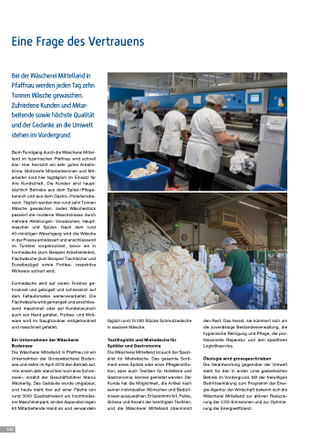 Die Wäscherei Mittelland in Pfaffnau ist ein Unternehmen der Grosswäscherei Boden- see und nahm im April 2019 den Betrieb auf. «Vor einem Jahr stand hier noch eine Schrei- nerei», erzählt der Geschäftsführer Marco Wäckerlig. Das Gebäude wurde umgebaut, und heute steht hier auf einer Fläche von rund 3000 Quadratmetern ein hochmoder- ner Maschinenpark, an den Apparaten legen 60 Mitarbeitende Hand an und verwandeln