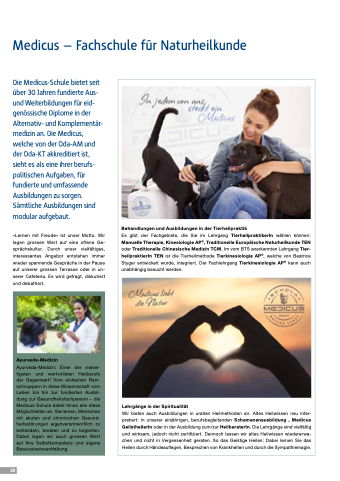 Die Medicus-Schule bietet seit über 30 Jahren fundierte Aus- und Weiterbildungen für eid- genössische Diplome in der Alternativ- und Komplementär- medizin an. Die Medicus, welche von der Oda-AM und der Oda-KT akkreditiert ist, sieht es als eine ihrer berufs- politischen Aufgaben, für fundierte und umfassende Ausbildungen zu sorgen. Sämtliche Ausbildungen sind modular aufgebaut.