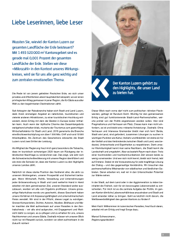 Als Mitglied der Regierung freut mich ganz besonders die Tatsache, dass im touristisch schwierigen 2020 kaum ein Rückgang der in- ländischen Nachfrage zu verzeichnen war. Das zeigt, wie sehr sich die Schweizerische Bevölkerung mit unserer Region identifiziert und wie stolz die Schweiz ist, dass der Kanton Luzern zu den Highlights unseres Landes zählt.