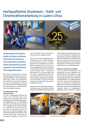 Mario Huser hat allen Grund zur Freude: Seine Blechtechnik AG feiert dieses Jahr ihr 25-jähriges Bestehen. «Es ist viel passiert in dieser Zeit», erinnert sich der Geschäfts- führer lachend und spielt damit insbeson- dere auf den technologischen Fortschritt an. Sichtbar wird dieser am Maschinenpark des Unternehmens und an den Produkten, die es herzustellen imstande ist.