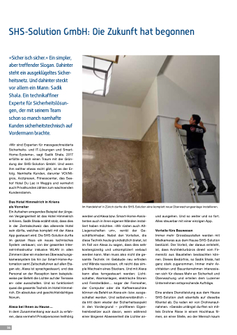 «Wir sind Experten für massgeschneiderte Sicherheits- und IT-Lösungen und Smart- Home-Systeme», sagt Sadik Shala. 2017 erfüllte er sich einen Traum mit der Grün- dung der SHS-Solution GmbH. Und wenn ihm seither etwas recht gibt, ist es der Er- folg. Namhafte Kunden, darunter VOI/Mi- gros, Arztpraxen, Fitnesscenter, das See- hof Hotel Du Lac in Weggis und vermehrt auch Privatkunden zählen zum wachsenden Kundenstamm.