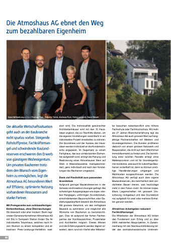 Die aktuelle Wirtschaftssituation geht auch an der Baubranche nicht spurlos vorbei. Steigende Rohstoffpreise, Fachkräfteman- gel und schwindende Bauland- reserven erschweren den Erwerb von günstigem Wohneigentum. Um privaten Bauherren trotz- dem den Wunsch vom Eigen- heim zu ermöglichen, legt die Atmoshaus AG besonderen Wert auf Effizienz, optimierte Nutzung vorhandener Ressourcen und starke Partner.
