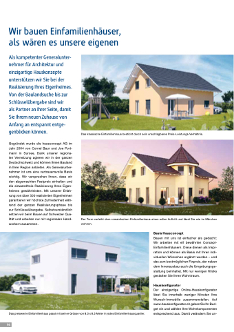 Gegründet wurde die hausconcept AG im Jahr 2004 von Cornel Baur und Joe Port- mann in Sursee. Dank unserer regiona- len Vernetzung agieren wir in der ganzen Deutschschweiz und können Ihnen Bauland in Ihrer Region anbieten. Als Generalunter- nehmer ist uns eine vertrauensvolle Basis wichtig. Wir versprechen Ihnen, dass wir den abgemachten Festpreis einhalten und die einwandfreie Realisierung Ihres Eigen- heimes gewährleisten. Mit unserer Erfah- rung von über 300 realisierten Eigenheimen garantieren wir höchste Zufriedenheit wäh- rend der ganzen Realisierungsphase bis zur Schlüsselübergabe. Selbstverständlich setzen wir beim Bauen auf Schweizer Qua- lität und arbeiten nur mit regionalen Hand- werkern zusammen.