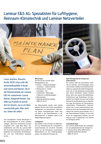 Lonza, Bachem, Novartis, Roche, BASF, Empa oder die Universitätsspitäler in Basel oder Zürich sind Namen, die in der Referenzenliste der Laminar E&S AG vorkommen. Grosse Namen, klingende Namen. Das KMU aus Pratteln ist primär dort im Einsatz, wo es um Rein- raumtechnik geht. Aber nicht nur. Sehen Sie selbst.