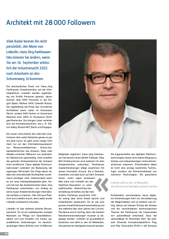 Die wöchentlichen Posts von Hans-Jörg Fankhauser, Arealentwickler, auf der Inter- netplattform LinkedIn werden regelmäs- sig von 20000 Personen gelesen, davon wohnen über 5000 Personen in der Re- gion Basel. Weitere 5000 LinkedIn-Nutzer, die regelmässig die Posts des innovativen Architekten lesen, leben im Grossraum Zürich, andere 3000 Nutzer im Grossraum München bzw. 2000 im Grossraum Stutt- gart/Karlsruhe. Die übrigen Leser verteilen sich auf Innovationszentren, wie z. B. Sili- con Valley, Boston MIT, Berlin und Singapur.