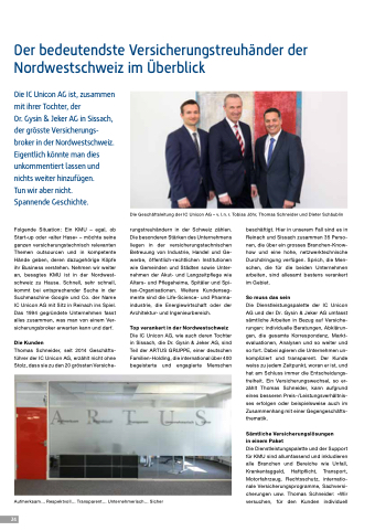 Folgende Situation: Ein KMU – egal, ob Start-up oder «alter Hase» – möchte seine ganzen versicherungstechnisch relevanten Themen outsourcen und in kompetente Hände geben, deren dazugehörige Köpfe ihr Business verstehen. Nehmen wir weiter an, besagtes KMU ist in der Nordwest- schweiz zu Hause. Schnell, sehr schnell, kommt bei entsprechender Suche in der Suchmaschine Google und Co. der Name IC Unicon AG mit Sitz in Reinach ins Spiel. Das 1994 gegründete Unternehmen fasst alles zusammen, was man von einem Ver- sicherungsbroker erwarten kann und darf.