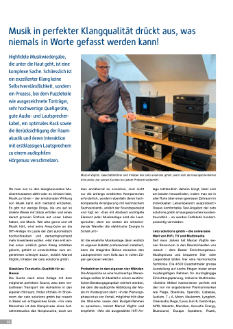 Ob man nun zu den klangbewussten Mu- sikenthusiasten zählt oder es einfach liebt, Musik zu hören – der emotionalen Wirkung von Musik kann sich niemand entziehen. Es gibt nur wenige Dinge, die uns auf so direkte Weise mit Glück erfüllen und einen derart grossen Einfluss auf unser Leben haben, wie Musik. Wer also gerne und oft Musik hört, wird seine Ansprüche an die HiFi-Anlage im Laufe der Zeit automatisch hochschrauben und dementsprechend mehr investieren wollen. «Hat man erst ein- mal einen wirklich guten Klang schätzen gelernt, gehört er unverzichtbar zum an- genehmen Lifestyle dazu», erzählt Marcel Vögtlin, Inhaber der ceto solutions gmbh.
