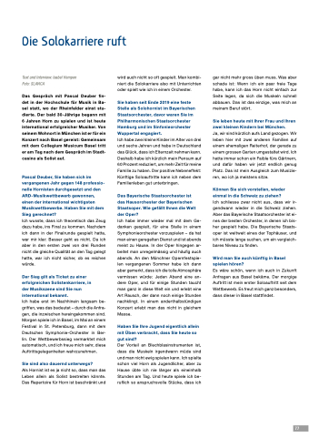 Das Gespräch mit Pascal Deuber fin- det in der Hochschule für Musik in Ba- sel statt, wo der Rheinfelder einst stu- dierte. Der bald 30-Jährige begann mit 6 Jahren Horn zu spielen und ist heute international erfolgreicher Musiker. Von seinem Wohnort in München ist er für ein Konzert nach Basel gereist: Gemeinsam mit dem Collegium Musicum Basel tritt er am Tag nach dem Gespräch im Stadt- casino als Solist auf.