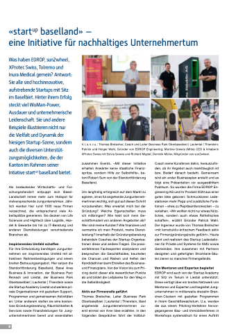 Was haben EDROP, sun2wheel, XProtec Swiss, Tolremo und Inura Medical gemein? Antwort: Sie alle sind hochinnovative, aufstrebende Startups mit Sitz im Baselbiet. Hinter ihrem Erfolg steckt viel WoMan-Power, Ausdauer und unternehmerische Leidenschaft. Sie und andere Beispiele illustrieren nicht nur die Vielfalt und Dynamik der hiesigen Startup-Szene, sondern auch die diversen Unterstüt- zungsmöglichkeiten, die der Kanton im Rahmen seiner Intiative startup baselland bietet.
