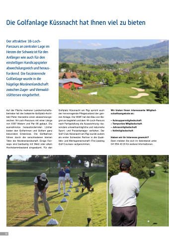 Golfplatz Küssnacht am Rigi spricht auch der hervorragende Pflegezustand der gan- zen Anlage. Der WWF hat den Bau von Be- ginn an begleitet und dem 18-Loch-Parours nach Fertigstellung die Auszeichnung «be- sonders umweltverträgliche und naturnahe Sport- und Freizeitanlage» verliehen. Der Golf Club Küssnacht am Rigi wurde zudem als erster Schweizer Partner in die Quali- täts- und Wertegemeinschaft «The Leading Golf Courses» aufgenommen.