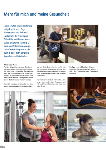 In den letzten Jahren beständig aufgefrischt, setzt Zugs Fitnessarena und Wellness- landschaft, der Fitnesspark Eichstätte, weit herum Mass- stäbe. Ein breites Trainings-, Kurs- und Entspannungsange- bot offeriert Programme, die auch in einer dicht gefüllten Agenda ihren Platz finden.