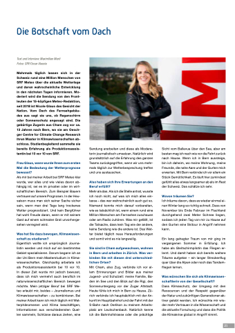 Eigentlich wollte ich ursprünglich Journa- listin werden und mich auf ein bestimmtes Gebiet spezialisieren. Darum begann ich an der Uni Bern mein Masterstudium in Klima- wissenschaften. Gleichzeitig arbeitete ich als Produktionsassistentin bei 10 vor 10. In dieser Zeit wurde mir jedoch bewusst, dass ich mich vermehrt auch beruflich im naturwissenschaftlichen Bereich bewegen möchte. Mein jetziger Beruf bei SRF Me- teo erlaubt mir, beides – Journalismus und Klimawissenschaften – zu kombinieren. Bei meiner Arbeit kann ich mich täglich mit Wet- terphänomenen und Klima beschäftigen, Informationen aus verschiedensten Quel- len sammeln, Schlüsse daraus ziehen, eine