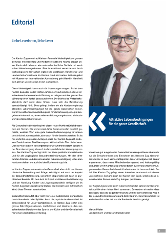 Der Regierungsrat wird auch in den kommenden Jahren der Gesund- heitspolitik einen hohen Wert zumessen. So werden wir weiter dazu beitragen, dass die Zuger Bevölkerung und die Wirtschaft das Plus in der Gesundheitsversorgung ganz direkt spüren. Denn Gesundheit ist ein hohes Gut – das hat uns die Pandemie deutlich gezeigt.