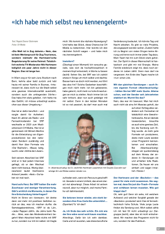 Seit seinem Abschied bei SRF wird er in fast jedem Interview gefragt, ob er den Wechsel denn nicht bereue. Wenig über- raschend lautet Hartmanns Antwort jeweils: «Nein.» Da ha- ken wir mal nach.