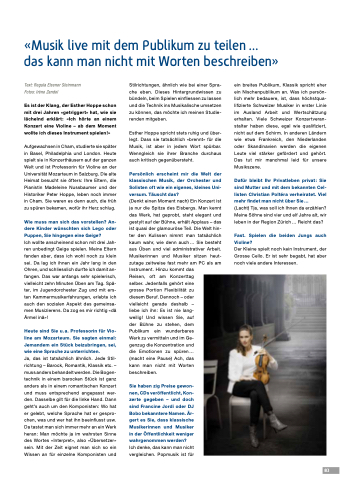 ein breites Publikum, Klassik spricht eher ein Nischenpublikum an. Was ich persön- lich mehr bedauere, ist, dass höchstqua- lifizierte Schweizer Musiker in erster Linie im Ausland Arbeit und Wertschätzung erhalten. Viele Schweizer Konzertveran- stalter haben diese, egal wie qualifiziert, nicht auf dem Schirm. In anderen Ländern wie etwa Frankreich, den Niederlanden oder Skandinavien werden die eigenen Leute viel stärker gefördert und gehört. Das tut mir manchmal leid für unsere Musikszene.