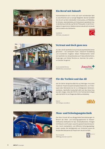 81 BEST OF BEST OF VoranzeigenEin Beruf mit ZukunftHandwerksberufe sind in einer sich rasch ver%u00e4ndernden Welt so zukunftssicher wie nur wenige T%u00e4tigkeiten. Bei der GLAESER AG, die sich auf den individuellen Innenausbau und M%u00f6belbau f%u00fcr Schulen, Gastrobetriebe und Institutionen spezialisiert hat, ist die Nachwuchsf%u00f6rderung Teil der Philosophie. In der fi rmeneigenen Jungschreiner-Akademie lernen aktuell acht Lernende das Einmaleins des Handwerks.F%u00fcr die Torlinie und das AllSeit 50 Jahren fertigt die elfab AG aus Mellingen mit einem modernen Maschinenpark komplexe Elektronik, von Prototypen %u00fcber Kleinserien bis hin zu mittelgrossen Serienproduktionen. Namhafte Kundschaft z%u00e4hlt auf das Know-how aus dem Aargau: etwa die FIFA f%u00fcr ihre Torlinientechnologie oder die NASA f%u00fcr ein fliegendes Weltraumteleskop. Mess- und SchwingungstechnikDie Vibro Consult AG aus Brugg bietet Dienstleistungen im Bereich der Mess- und Schwingungstechnik f%u00fcr Wasserkraftwerke, Kraftwerke mit Gas- & Dampfturbinen, Anlagen mit Motoren und Pumpen sowie f%u00fcr grosse Industriemaschinen. Durch kompetente und effi ziente Schwingungsdiagnosen werden die Verf%u00fcgbarkeit und Sicherheit sowie die flexible Betriebsweise der Maschinen deutlich erh%u00f6ht. GLAESER AG5405 Baden, www.glaeser.chElfab AG5507 Mellingen, www.elfab.chVibro-Consult AG5200 Brugg, www.vibro-consult.ch56118Vertraut und doch ganz neuAus der L%u00e4ndli-Apotheke ist die Amavita Apotheke W%u00fcrenlos geworden %u2013 mit vertrautem Team, moderner Ausstattung und erweitertem Angebot. Neben Medikamenten bietet die Apotheke neu beispielsweise auch Gesundheitschecks, Impfungen und Online-Termine an. Kommen Sie vorbei %u2013 wir beraten Sie gerne!Amavita Apotheke W%u00fcrenlos5436 W%u00fcrenlos, www.amavita.ch96104