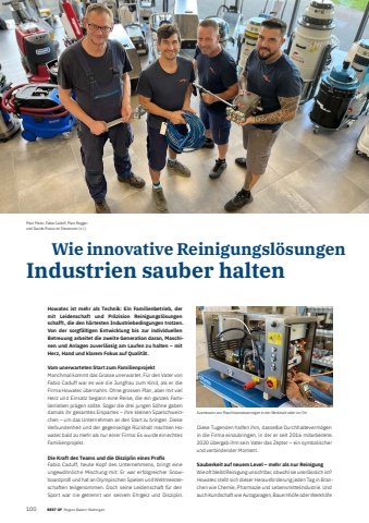 100 BEST OF BEST OF Portrait xxx Region Baden-Wettingen Wie innovative Reinigungsl%u00f6sungen Industrien sauber haltenHowatec ist mehr als Technik: Ein Familienbetrieb, der mit Leidenschaft und Pr%u00e4zision Reinigungsl%u00f6sungen schafft, die den h%u00e4rtesten Industriebedingungen trotzen. Von der sorgf%u00e4ltigen Entwicklung bis zur individuellen Betreuung arbeitet die zweite Generation daran, Maschinen und Anlagen zuverl%u00e4ssig am Laufen zu halten %u2013 mit Herz, Hand und klarem Fokus auf Qualit%u00e4t.Vom unerwarteten Start zum FamilienprojektManchmal kommt das Grosse unerwartet. F%u00fcr den Vater von Fabio Caduff war es wie die Jungfrau zum Kind, als er die Firma Howatec %u00fcbernahm. Ohne grossen Plan, aber mit viel Herz und Einsatz begann eine Reise, die ein ganzes Familienleben pr%u00e4gen sollte. Sogar die drei jungen S%u00f6hne gaben damals ihr gesamtes Erspartes %u2013 ihre kleinen Sparschweinchen %u2013 um das Unternehmen an den Start zu bringen. Diese Verbundenheit und der gegenseitige R%u00fcckhalt machten Howatec bald zu mehr als nur einer Firma: Es wurde ein echtes Familienprojekt.Die Kraft des Teams und die Disziplin eines Profi sFabio Caduff, heute Kopf des Unternehmens, bringt eine ungew%u00f6hnliche Mischung mit: Er war erfolgreicher Snowboardprofi und hat an Olympischen Spielen und Weltmeisterschaften teilgenommen. Doch seine Leidenschaft f%u00fcr den Sport war nie getrennt von seinem Ehrgeiz und Disziplin. Diese Tugenden halfen ihm, dasselbe Durchhalteverm%u00f6gen in die Firma einzubringen, in der er seit 2016 mitarbeitete. 2020 %u00fcbergab ihm sein Vater das Zepter %u2013 ein symbolischer und verbindender Moment.Sauberkeit auf neuem Level %u2013 mehr als nur ReinigungWie oft bleibt Reinigung unsichtbar, obwohl sie unerl%u00e4sslich ist? Howatec stellt sich dieser Herausforderung jeden Tag in Branchen wie Chemie, Pharmazie und Lebensmittelindustrie. Und auch Kundschaft wie Autogaragen, Bauernh%u00f6fe oder Werkh%u00f6fe Marc Meier, Fabio Caduff, Marc Rogger und Davide Russo im Showroom (v. l.)Ausmessen von Maschinensteuerungen in der Werkstatt oder vor Ort