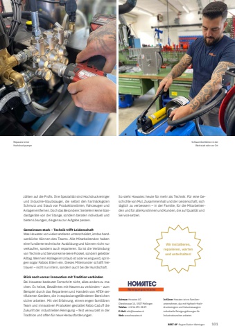 BEST OF Region Baden-Wettingen BEST OF Portrait xxx 1012Adresse: Howatec AG Gheidstrasse 1A, 5507 MellingenTelefon: +41 56 491 28 29E-Mail: info@howatec.chWeb: www.howatec.chIn K%u00fcrze: Howatec ist ein Familienunternehmen, das mit Hightech-Hochdruckreinigern und Industriesaugern individuelle Reinigungsl%u00f6sungen f%u00fcr Industriebranchen anbietet.z%u00e4hlen auf die Profi s. Ihre Spezialit%u00e4t sind Hochdruckreiniger und Industrie-Staubsauger, die selbst den hartn%u00e4ckigsten Schmutz und Staub von Produktionslinien, Fahrzeugen und Anlagen entfernen. Doch das Besondere: Sie liefern keine Standardger%u00e4te von der Stange, sondern beraten individuell und bieten L%u00f6sungen, die genau zur Aufgabe passen.Gemeinsam stark %u2013 Technik trifft LeidenschaftWas Howatec von vielen anderen unterscheidet, ist das handwerkliche K%u00f6nnen des Teams. Alle Mitarbeitenden haben eine fundierte technische Ausbildung und k%u00f6nnen nicht nur verkaufen, sondern auch reparieren. So ist die Verbindung von Technik und Service keine leere Floskel, sondern gelebter Alltag. Wenn ein Kollege im Urlaub ist oder es eng wird, springen sogar Fabios Eltern ein. Dieses Miteinander schafft Vertrauen %u2013 nicht nur intern, sondern auch bei der Kundschaft.Blick nach vorne: Innovation mit Tradition verbindenBei Howatec bedeutet Fortschritt nicht, alles anders zu machen. Es heisst, Bew%u00e4hrtes mit Neuem zu verbinden %u2013 zum Beispiel durch das Reparieren und Handeln von ATEX-zertifi zierten Ger%u00e4ten, die in explosionsgef%u00e4hrdeten Bereichen sicher arbeiten. Mit viel Erfahrung, einem engen famili%u00e4ren Team und innovativen Produkten gestaltet Fabio Caduff die Zukunft der industriellen Reinigung %u2013 fest verwurzelt in der Tradition und offen f%u00fcr neue Herausforderungen.So steht Howatec heute f%u00fcr mehr als Technik: F%u00fcr eine Geschichte von Mut, Zusammenhalt und der Leidenschaft, sich t%u00e4glich zu verbessern %u2013 in der Familie, f%u00fcr die Mitarbeitenden und f%u00fcr alle Kundinnen und Kunden, die auf Qualit%u00e4t und Service setzen.Wir installieren, reparieren, warten und unterhalten!Reparatur einer HochdruckpumpeSchlauchkonfektion in der Werkstatt oder vor Ort