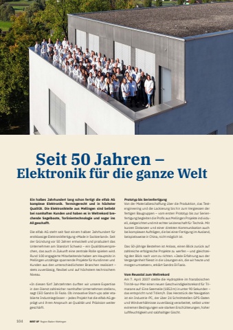 104 21 BEST OF Portrait xxx Seit 50 Jahren %u2013 Elektronik f%u00fcr die ganze WeltEin halbes Jahrhundert lang schon fertigt die elfab AG komplexe Elektronik. Termingerecht und in h%u00f6chster Qualit%u00e4t. Die Elektronikteile aus Mellingen sind beliebt bei namhaften Kunden und haben es in Weltrekord brechende Segelboote, Torlinientechnologie und sogar ins All geschafft.Die elfab AG steht seit fast einem halben Jahrhundert f%u00fcr erstklassige Elektronikfertigung %u00abMade in Switzerland%u00bb. Seit der Gr%u00fcndung vor 50 Jahren entwickelt und produziert das Unternehmen am Standort Schweiz %u2013 ein Qualit%u00e4tsversprechen, das auch in Zukunft eine zentrale Rolle spielen wird. Rund 100 engagierte Mitarbeitende haben am Hauptsitz in Mellingen unz%u00e4hlige spannende Projekte f%u00fcr Kundinnen und Kunden aus den unterschiedlichsten Branchen realisiert %u2013 stets zuverl%u00e4ssig, flexibel und auf h%u00f6chstem technischem Niveau.%u00abIn diesen f%u00fcnf Jahrzehnten durften wir unsere Expertise in den Dienst zahlreicher namhafter Unternehmen stellen%u00bb, sagt CEO Sandro Di Fazio. Ob innovative Start-ups oder etablierte Industriegr%u00f6ssen %u2013 jedes Projekt hat die elfab AG gepr%u00e4gt und ihren Anspruch an Qualit%u00e4t und Pr%u00e4zision weiter gesch%u00e4rft.Prototyp bis SerienfertigungVon der Materialbeschaffung %u00fcber die Produktion, das Testengineering und die Lackierung bis hin zum Vergiessen der fertigen Baugruppen %u2013 vom ersten Prototyp bis zur Serienfertigung begleiten die Profi s aus Mellingen Projekte individuell, zielgerichtet und mit echter Leidenschaft f%u00fcr Technik. Mit kurzen Distanzen und einer direkten Kommunikation auch bei komplexen Auftr%u00e4gen, die bei einer Fertigung im Ausland, beispielsweise in China, nicht m%u00f6glich ist.Das 50-j%u00e4hrige Bestehen ist Anlass, einen Blick zur%u00fcck auf zahlreiche erfolgreiche Projekte zu werfen %u2013 und gleichzeitig den Blick nach vorn zu richten. %u00abJede Erfahrung aus der Vergangenheit fliesst in die L%u00f6sungen ein, die wir heute und morgen umsetzen%u00bb, erkl%u00e4rt Sandro Di Fazio.Vom Reusstal zum WeltrekordAm 7.%u00a0April 2007 stellte die Hydropt%u00e8re im franz%u00f6sischen Trinit%u00e9-sur-Mer einen neuen Geschwindigkeitsrekord f%u00fcr Trimarane auf: Eine Seemeile (1852 m) in unter 90 Sekunden%u00a0%u2013 das entspricht rund 74 km/h. Das Herzst%u00fcck der Navigation ist ein Industrie-PC, der %u00fcber 24 Schnittstellen GPS-Daten und Windverh%u00e4ltnisse zuverl%u00e4ssig verarbeitet, selbst unter extremen Bedingungen wie starken Ersch%u00fctterungen, hoher Luftfeuchtigkeit und salzhaltiger Gischt.BEST OF Region Baden-Wettingen