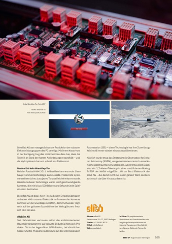BEST OF Portrait xxx 10522Adresse: elfab AGStetterstrasse 25 %u2013 27, 5507 MellingenTelefon: +41 56 481 80 20E-Mail: info@elfab.ch Web: www.elfab.ch In K%u00fcrze: Ob projektorientierte Produktionen mit Einmalcharakter oder langj%u00e4hrige Serienproduktionen mit Lifecycle-Management: Die elfab%u00a0AG ist erfahrener Elektronik-Partner f%u00fcr beides.Die elfab AG war massgeblich an der Produktion der robusten Elektronikbaugruppen des PC beteiligt. Mit ihrem Know-how in der Fertigung trug das Unternehmen dazu bei, dass die Technik an Bord den harten Anforderungen standh%u00e4lt %u2013 und die Hydropt%u00e8re sicher und schnell ans Ziel kommt.Dank elfab kein Wembley-TorBei der Fussball-WM 2014 in Brasilien kam erstmals %u00fcberhaupt Torlinientechnologie zum Einsatz. Modernste Systeme stellten sicher, dass jedes Tor zweifelsfrei erkannt wurde. Herzst%u00fcck dieser Technologie waren Hochgeschwindigkeitskameras, die mit bis zu 500 Bildern pro Sekunde jede Spielsituation festhielten.Die elfab AG ist stolz, ihren Teil zu diesem Erfolg beigetragen zu haben. %u00abMit unserer Elektronik im Inneren der Kameras konnten wir die Grundlage schaffen, damit Schweizer Hightech auf der gr%u00f6ssten Sportb%u00fchne der Welt gl%u00e4nzte%u00bb, freut sich CEO Di Fazio.elfab im AllSeit Jahrzehnten vertrauen selbst die ambitioniertesten Raumfahrtprogramme auf robuste Industrial Network Produkte. Ob in der legend%u00e4ren MIR-Station, bei s%u00e4mtlichen Space-Shuttle-Missionen oder heute auf der Internationalen Raumstation (ISS) %u2013 diese Technologie hat ihre Zuverl%u00e4ssigkeit im All immer wieder eindrucksvoll bewiesen.K%u00fcrzlich wurde etwa das Stratospheric Observatory for Infrared Astronomy (SOFIA), ein gemeinsames deutsch-amerikanisches Weltraumforschungsprojekt, weiterentwickelt. Dabei wird ein 2,7-Meter-Teleskop in einer modifi zierten Boeing 747SP der NASA mitgef%u00fchrt. Mit an Bord Elektronik der elfab%u00a0AG %u2013 die damit nicht nur in der ganzen Welt, sondern auch noch dar%u00fcber hinaus pr%u00e4sent ist.links: Wembley Tor, Foto: ZDFrechts: elfab im AllFoto: NASA/DLR (SOFIA)BEST OF Region Baden-Wettingen