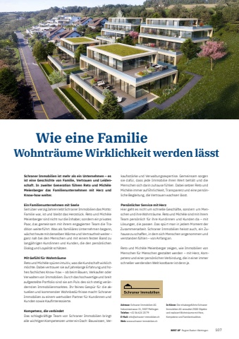 BEST OF Region Baden-Wettingen BEST OF Portrait xxx 1071 Wie eine Familie Wohntr%u00e4ume Wirklichkeit werden l%u00e4sstAdresse: Schraner Immobilien AGIndustriestrasse 31, 5507 MellingenTelefon: +41 56 624 20 79E-Mail: info@schraner-immobilien.chWeb: www.schraner-immobilien.chIn K%u00fcrze: Die inhabergef%u00fchrte Schraner Immobilien AG verwaltet 2500 Objekte und realisiert Wohntr%u00e4ume mit Herz, Kompetenz und Familientradition.Schraner Immobilien ist mehr als ein Unternehmen %u2013 es ist eine Geschichte von Familie, Vertrauen und Leidenschaft. In zweiter Generation f%u00fchren Reto und Mich%u00e8le Meienberger das Familienunternehmen mit Herz und Know-how weiter.Ein Familienunternehmen mit SeeleSeit %u00fcber vierzig Jahren lebt Schraner Immobilien das Motto: Familie war, ist und bleibt das Herzst%u00fcck. Reto und Mich%u00e8le Meienberger sind nicht nur die Inhaber, sondern ein privates Paar, das gemeinsam mit ihrem engagierten Team die Tradition weiterf%u00fchrt. Was als famili%u00e4res Unternehmen begann, w%u00e4chst heute mit derselben W%u00e4rme und Vertrautheit weiter%u00a0%u2013 ganz nah bei den Menschen und mit einem festen Band zu langj%u00e4hrigen Kundinnen und Kunden, die den pers%u00f6nlichen Dialog und Loyalit%u00e4t sch%u00e4tzen.Mit Gef%u00fchl f%u00fcr Wohntr%u00e4umeReto und Mich%u00e8le sp%u00fcren intuitiv, was die Kundschaft wirklich m%u00f6chte. Dabei vertrauen sie auf jahrelange Erfahrung und hohes fachliches Know-how %u2013 ob beim Bauen, Verkaufen oder Verwalten von Immobilien. Durch das hochwertige und breit aufgestellte Portfolio sind sie am Puls des sich stetig ver%u00e4ndernden Immobilienmarktes. Ihr feines Gesp%u00fcr f%u00fcr die aktuellen und kommenden Wohnbed%u00fcrfnisse macht Schraner Immobilien zu einem wertvollen Partner f%u00fcr Kundinnen und Kunden sowie Kaufi nteressierte.Kompetenz, die verbindetDas schlagkr%u00e4ftige Team von Schraner Immobilien bringt alle wichtigen Kompetenzen unter ein Dach: Bauwissen, Verkaufsst%u00e4rke und Verwaltungsexpertise. Gemeinsam sorgen sie daf%u00fcr, dass jede Immobilie ihren Wert beh%u00e4lt und die Menschen sich darin zuhause f%u00fchlen. Dabei setzen Reto und Mich%u00e8le immer auf Ehrlichkeit, Transparenz und eine pers%u00f6nliche Begleitung, die Vertrauen wachsen l%u00e4sst.Pers%u00f6nlicher Service mit HerzHier geht es nicht um schnelle Gesch%u00e4fte, sondern um Menschen und ihre Wohntr%u00e4ume. Reto und Mich%u00e8le sind mit ihrem Team pers%u00f6nlich f%u00fcr ihre Kundinnen und Kunden da %u2013 mit L%u00f6sungen, die passen. Das sp%u00fcrt man in jedem Moment der Zusammenarbeit. Schraner Immobilien heisst auch, ein Zuhause zu schaffen, in dem sich Menschen angenommen und verstanden f%u00fchlen %u2013 von Anfang an.Reto und Mich%u00e8le Meienberger zeigen, wie Immobilien von Menschen f%u00fcr Menschen gestaltet werden %u2013 mit Herz, Kompetenz und einer pers%u00f6nlichen Verbindung, die in einer immer schneller werdenden Welt kostbarer ist denn je.