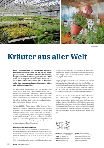 110 BEST OF BEST OF Portrait xxx Region Baden-WettingenKr%u00e4uter aus aller WeltAdresse: Bottis Kr%u00e4uterg%u00e4rtnerei GmbHGrabenmattenstrasse 18, 5608 StettenTelefon: +41 56 496 24 94E-Mail: offi ce@kraeuter.store Web: www.bottipflanzen.ch In K%u00fcrze: Wer nicht extra nach Stetten fahren will, kann die Kr%u00e4uter, Heilpflanzen und Setzlinge auch bequem im Online-Shop von Bottis Kr%u00e4uterg%u00e4rtnerei bestellen.Bottis Kr%u00e4uterg%u00e4rtnerei ist schweizweit einzigartig. Kundinnen und Kunden reisen von weit her an, um die grosse Auswahl an frischen, biodynamischen Kr%u00e4utern, Heilpflanzen und Gem%u00fcsesetzlingen zu entdecken. Aber auch, um im tropisch atmosph%u00e4rischen Treibhaus an einem Thai-Festival teilzunehmen. Oder in Workshops selbst Hand anzulegen und eigene Kr%u00e4utersalze, -salben oder -tinkturen herzustellen.Ob jemand eine Oregano-Sorte sucht, die auf der Zunge brennt, ob ein Hotel einen Koch aus Mexiko einl%u00e4dt, der f%u00fcr seine authentischen Gerichte ein ganz bestimmtes mexikanisches Pfefferblatt braucht, oder ob Absolventen eines Kochkurses feststellen, dass kein Detailh%u00e4ndler die passende Sorte Thai-Basilikum f%u00fchrt, immer dann ist Bottis Kr%u00e4uterg%u00e4rtnerei in Stetten die erste Adresse.Auf %u00fcber 20 000 m2 Fl%u00e4che, davon 1500 m2 in einem Warmtreibhaus, kultivieren die Familie Bottlang sowie zwei Mitarbeitende eine aussergew%u00f6hnliche Vielfalt an Kr%u00e4utern, Heilpflanzen und saisonalen Gem%u00fcsesetzlingen. Alle Pflanzen werden biodynamisch angebaut, mit organisch-lebendigen D%u00fcngemitteln versorgt und gest%u00e4rkt. Anstelle schnelllebiger Hybriden-Gem%u00fcsesetzlinge setzt Bottis Kr%u00e4uterg%u00e4rtnerei auf traditionelle, oft jahrzehntealte Sorten, die ihre Besonderheit und Vitalit%u00e4t auch in Zukunft bewahren. Kunden bringen exotische Kr%u00e4uterAlles begann 2008, als Daniel Bottlang seine 1999 gegr%u00fcndete G%u00e4rtnerei eigentlich verkaufen wollte. Die Branche war ihm zu industriell geworden. Er suchte nach etwas, das nicht jeder anbietet. %u00abDann erinnerte ich mich an meine Leidenschaft f%u00fcr Kr%u00e4uter und daran, dass ich schon als Kind ein eigenes Mini-Treibhaus betrieben hatte%u00bb, erz%u00e4hlt Bottlang. Das neue Konzept fand sofort Anklang, und seither ist das Angebot stetig gewachsen. %u00abWenn ich eine bestimmte Sorte einmal nicht habe, bringen sie mir die Kunden von ihrer n%u00e4chsten Reise mit%u00bb, sagt er schmunzelnd.Das ganzj%u00e4hrig mindestens 16 Grad warme Treibhaus bildet das Herzst%u00fcck der Kr%u00e4uterg%u00e4rtnerei. Auf einer Teilfl%u00e4che haben die Bottlangs, fast wie in der Masoala-Halle des Z%u00fcrcher Zoos, tropische und exotische Pflanzen eingepflanzt. Besonders an k%u00fchlen oder regnerischen Tagen lohnt sich ein Besuch: Dann kommt echtes tropisches Regenwald-Feeling auf.Immer wieder wird das Treibhaus auch zur B%u00fchne f%u00fcr besondere Erlebnisse. Schon zur Tradition geworden ist das ThaiFestival am ersten Juni-Wochenende, wenn K%u00f6che aus dem Land des L%u00e4chelns ihre Gerichte mit frischen Kr%u00e4utern von Botti verfeinern. Daneben stehen Kr%u00e4uterkunde-Kurse und Workshops auf dem Programm, bei denen man nicht nur viel lernt, sondern auch selbst Kr%u00e4utersalze, -salben und -tinkturen herstellen kann. F%u00fcr eine perfekte kleine Auszeit vom Alltag.Daniel Bottlang