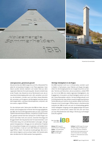 BEST OF Region Brugg-Windisch BEST OF Portrait xxx 11547Lokal gewonnen, gemeinsam genutztAktuell sind bei der IBB Energie AG rund 20 umfassende Projekte f%u00fcr erneuerbare Energie in der Planungsphase. Zwei davon wurden bereits realisiert und nutzen Holz aus dem regionalen Wald als Fernw%u00e4rmequelle. Derzeit entsteht das erste Projekt, das Abw%u00e4rme eines Rechenzentrums als erneuerbare Heizenergiequelle nutzt. %u00abWir verstehen uns nicht nur als Anbieterin, sondern auch als Motor dieses Wandels. Wir vernetzen und fungieren als Bindeglied zwischen jenen, die Energie liefern, wie etwa Industriepartner, und jenen, die sie nutzen%u00bb, erg%u00e4nzt Pfi ffner.F%u00fcr die n%u00e4chsten zehn Jahre plant die IBB ein Netz, das verbindet: eine Energieachse im Herzen des Versorgungsgebiets der IBB. Ziel: Rund 100 Gigawattstunden pro Jahr, womit fast 7000 Einfamilienh%u00e4user beheizt, und j%u00e4hrlich 22 000 Tonnen CO2 gespart werden k%u00f6nnten (entspricht 11 000 Fl%u00fcgen von Z%u00fcrich nach New York und zur%u00fcck). Zwischen Brunegg und Brugg entsteht die Hauptachse des Fernw%u00e4rmenetzes: rund 9 Kilometer lang, mit rund 40 Kilometern Leitungen. %u00abDie geplante Energieachse in Brugg und die zahlreichen Projekte f%u00fcr erneuerbare Energie sind ein grosses und kostenintensives Vorhaben, in das wir rund 200 Millionen investieren%u00bb, sagt Pfi ffner. %u00abDoch: Fernw%u00e4rme ist jetzt gefragt. Wer erst in zehn Jahren beginnt, wird es schwer haben. Wir handeln jetzt, denn die Weichen f%u00fcr 2040 werden heute gestellt.%u00bb Wichtige Arbeitgeberin in der RegionDie IBB investiert nicht nur in Infrastruktur, sondern auch in K%u00f6pfe: in Fachwissen, neue Talente und kluge L%u00f6sungen. %u00abDenn f%u00fcr die Energiesysteme von morgen brauchen wir beides: Technik und Menschen, die sie verstehen%u00bb, erkl%u00e4rt Pfi ffner. So ist die IBB eine starke regionale Arbeitgeberin, die Engagement, Innovation und Nachhaltigkeit vereint und mit den Zukunftsprojekten w%u00e4chst. Sie besch%u00e4ftigt aktuell rund 115 Mitarbeitende. Dazu z%u00e4hlen sowohl langj%u00e4hrig erfahrene Fachkr%u00e4fte als auch solche, die es werden wollen und frische Impulse in die Firma bringen. Pfi ffner betont: %u00abDie Wertsch%u00e4tzung bei der IBB ist echt und wird im Arbeitsalltag gelebt. Unser kollegialer Umgang und das gegenseitige Vertrauen machen den Unterschied%u00bb, betont der CEO, der sich freut, mit den Mitarbeitenden den Weg in Richtung nachhaltiger Zukunft zu gehen.Adresse: IBB Energie AGGaswerkstrasse 5, 5200 BruggTelefon: +41 56 460 28 00 E-Mail: info@ibbrugg.ch Web: www.ibbrugg.chIn K%u00fcrze: Die IBB Energie AG versorgt die Region Brugg und Umgebung mit Strom, Gas, Fernw%u00e4rme und Wasser, betreibt das Kommunikationsnetz und setzt sich besonders f%u00fcr nachhaltige Energie ein, insbesondere den Ausbau der Fernw%u00e4rme. Heizzentrale Sommerhalden