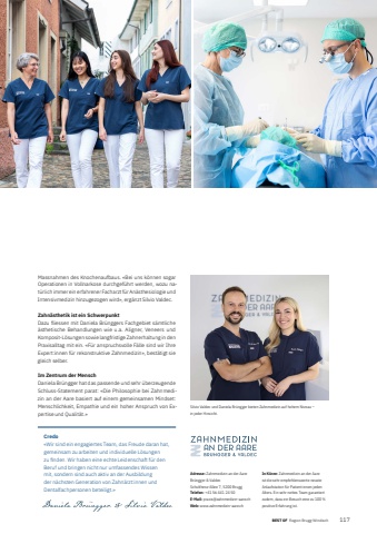 BEST OF Region Brugg-Windisch BEST OF Portrait xxx 1172Adresse: Zahnmedizin an der AareBr%u00fcngger & ValdecSchulthess-Allee 7, 5200 BruggTelefon: +41 56 441 24 50E-Mail: praxis@zahnmedizin-aare.chWeb: www.zahnmedizin-aare.chIn K%u00fcrze: Zahnmedizin an der Aare ist die sehr empfehlenswerte neuste Anlaufstation f%u00fcr Patient:innen jeden Alters. Ein sehr nettes Team garantiert zudem, dass ein Besuch eine zu 100 % positive Erfahrung ist.Silvio Valdec und Daniela Br%u00fcngger bieten Zahnmedizin auf hohem Niveau %u2013 in jeder Hinsicht. Massnahmen des Knochenaufbaus. %u00abBei uns k%u00f6nnen sogar Operationen in Vollnarkose durchgef%u00fchrt werden, wozu nat%u00fcrlich immer ein erfahrener Facharzt f%u00fcr An%u00e4sthesiologie und Intensivmedizin hinzugezogen wird%u00bb, erg%u00e4nzt Silvio Valdec. Zahn%u00e4sthetik ist ein SchwerpunktDazu fliessen mit Daniela Br%u00fcnggers Fachgebiet s%u00e4mtliche %u00e4sthetische Behandlungen wie u.a. Aligner, Veneers und Komposit-L%u00f6sungen sowie langfristige Zahnerhaltung in den Praxisalltag mit ein. %u00abF%u00fcr anspruchsvolle F%u00e4lle sind wir Ihre Expert:innen f%u00fcr rekonstruktive Zahnmedizin%u00bb, best%u00e4tigt sie gleich selber.Im Zentrum der MenschDaniela Br%u00fcngger hat das passende und sehr %u00fcberzeugende Schluss-Statement parat: %u00abDie Philosophie bei Zahnmedizin an der Aare basiert auf einem gemeinsamen Mindset: Menschlichkeit, Empathie und ein hoher Anspruch von Expertise und Qualit%u00e4t.%u00bb Credo%u00abWir sind ein engagiertes Team, das Freude daran hat, gemeinsam zu arbeiten und individuelle L%u00f6sungen zu fi nden. Wir haben eine echte Leidenschaft f%u00fcr den Beruf und bringen nicht nur umfassendes Wissen mit, sondern sind auch aktiv an der Ausbildung der n%u00e4chsten Generation von Zahn%u00e4rzt:innen und Dentalfachpersonen beteiligt.%u00bb