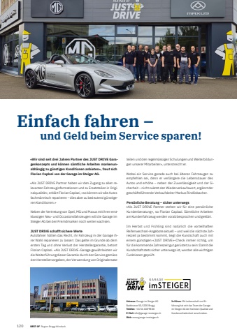 120 33 BEST OF BEST OF Portrait xxx Region Brugg-WindischAdresse: Garage im Steiger AGBadstrasse 50, 5200 BruggTelefon: +41 56 448 98 00E-Mail: info@garage-imsteiger.chWeb: www.garage-imsteiger.chIn K%u00fcrze: Mit Leidenschaft und Erfahrung hat sich das Team der Garage im Steiger AG der h%u00f6chsten Qualit%u00e4t und Kundenzufriedenheit verschrieben.Einfach fahren %u2013 und Geld beim Service sparen!%u00abWir sind seit drei Jahren Partner des JUST DRIVE Garagenkonzepts und k%u00f6nnen s%u00e4mtliche Arbeiten markenunabh%u00e4ngig zu g%u00fcnstigen Konditionen anbieten%u00bb, freut sich Florian Caplazi von der Garage im Steiger AG.%u00abAls JUST DRIVE Partner haben wir den Zugang zu allen relevanten Fahrzeuginformationen und zu Ersatzteilen in Originalqualit%u00e4t%u00bb, erkl%u00e4rt Florian Caplazi, %u00abso k%u00f6nnen wir alle Autos fachm%u00e4nnisch reparieren %u2013 dies aber zu bedeutend g%u00fcnstigeren Konditionen.%u00bbNeben der Vertretung von Opel, MG und Maxus mit ihren erstklassigen Neu- und Occasionsfahrzeugen will die Garage im Steiger AG bei den Fremdmarken noch weiter wachsen.JUST DRIVE schafft sichere WerteAutofahrer h%u00e4tten das Recht, ihr Fahrzeug in der Garage ihrer Wahl reparieren zu lassen: Das gelte im Grunde ab dem ersten Tag und ohne Verlust der Herstellergarantie, betont Florian Caplazi. %u00abAls JUST DRIVE-Garage gew%u00e4hrleisten wir die Weiterf%u00fchrung dieser Garantie durch den Service gem%u00e4ss den Herstellervorgaben, der Verwendung von Originalersatzteilen und den regelm%u00e4ssigen Schulungen und Weiterbildungen unserer Mitarbeiter%u00bb, unterstreicht er.Wobei ein Service gerade auch bei %u00e4lteren Fahrzeugen zu empfehlen sei, denn er verl%u00e4ngere die Lebensdauer des Autos und erh%u00f6he %u2013 neben der Zuverl%u00e4ssigkeit und der Sicherheit %u2013 nicht zuletzt den Wiederverkaufswert, erg%u00e4nzt der gesch%u00e4ftsf%u00fchrende Verkaufsleiter Markus Rindlisbacher.Pers%u00f6nliche Beratung %u2013 sicher unterwegs%u00abAls JUST DRIVE Partner stehen wir f%u00fcr eine pers%u00f6nliche Kundenberatung%u00bb, so Florian Caplazi. S%u00e4mtliche Arbeiten am Kundenfahrzeug werden vorab besprochen und gekl%u00e4rt.Im Herbst und Fr%u00fchling sind nat%u00fcrlich die vorteilhaften Reifenwechsel-Angebote aktuell %u2013 und weil die n%u00e4chste Jahreszeit ja bestimmt kommt, liegt die Kundschaft auch mit einem g%u00fcnstigen %u00abJUST DRIVE%u00bb-Check immer richtig, um f%u00fcr die kommende Jahreszeit gut ger%u00fcstet zu sein: Damit die Kundschaft stets sicher unterwegs ist, werden alle wichtigen Funktionen gepr%u00fcft.